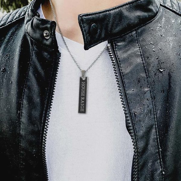 Engraved text “HOUSE RAIGE” on polished stainless steel. The chain and clasp are also stainless steel.